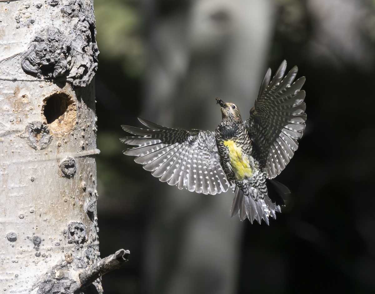 I made three trips to the aspen grove over the next several days and tried to photograph the comings and goings of the adults as they fed their very hungry young. The male had a pattern of landing on a tree trunk about 30 feet from the nest tree, looking around, and then flying over to the nest cavity. The female usually flew directly to the nest tree, calling as she flew in. I was hoping to get some photos of the birds flying in to the tree trunk with wings spread and feet outstretched but I discovered this was challenging. I generally use the mechanical shutter option in my camera which shoots at about 12 frames per second. That is generally plenty fast to capture moving subjects. But these birds came in so quickly I decided to switch to the electronic shutter which provides 20 frames pr second. That made all the difference in the world. As soon as I thought a bird was flying toward the nest tree I just pressed the shutter and held it. The up side was a series of photos showing different poses and wing beats as the woodpecker came in for a landing. The down side was it made for a crazy number of images to go through that were only slightly different from one another.