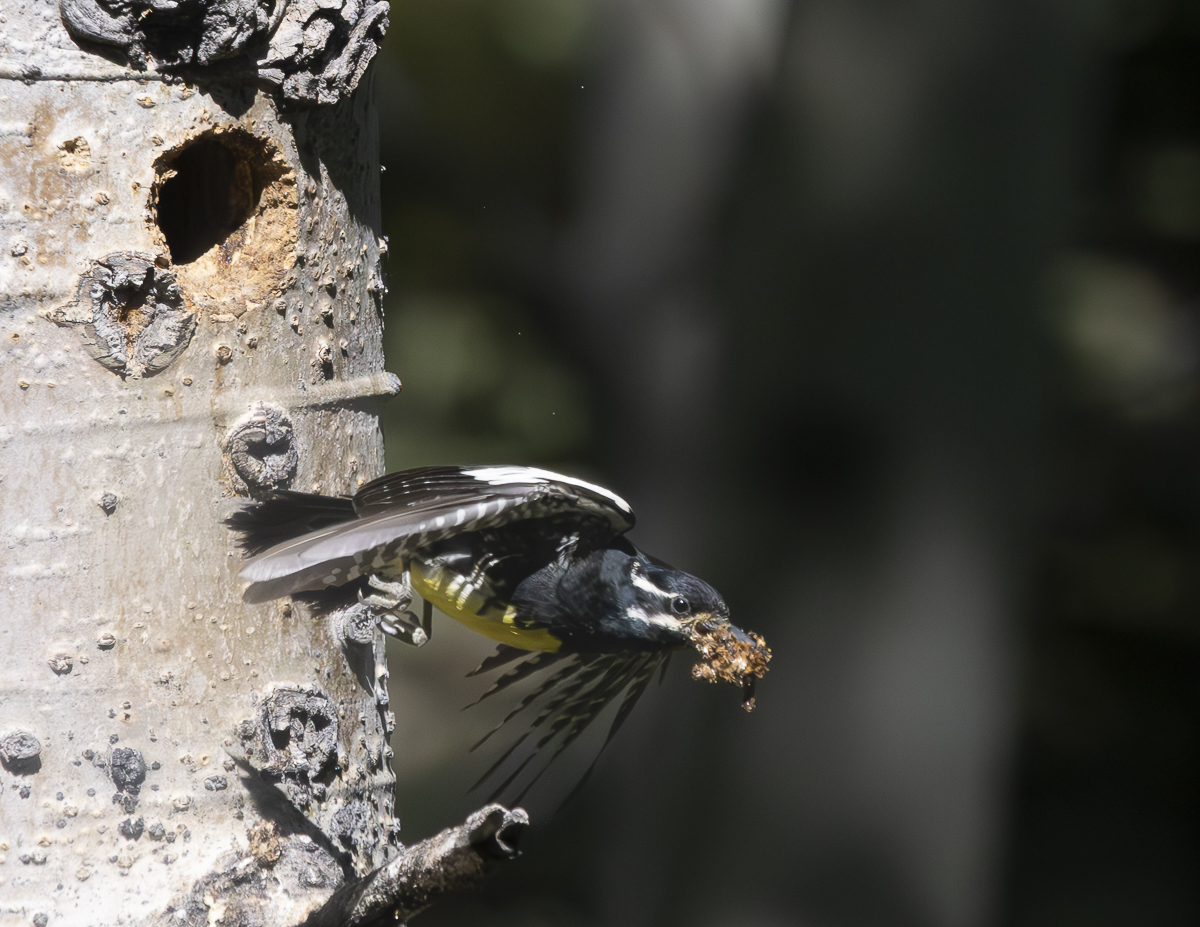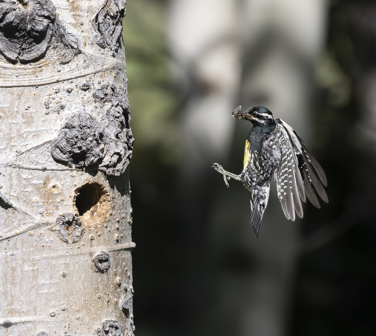 Williamson’s sapsucker nest cavity. Male has just arrived with food for young. Note the start of another hole on lower left of trunk. This is a cropped image using a 500mm telephoto.