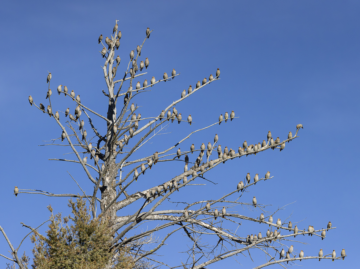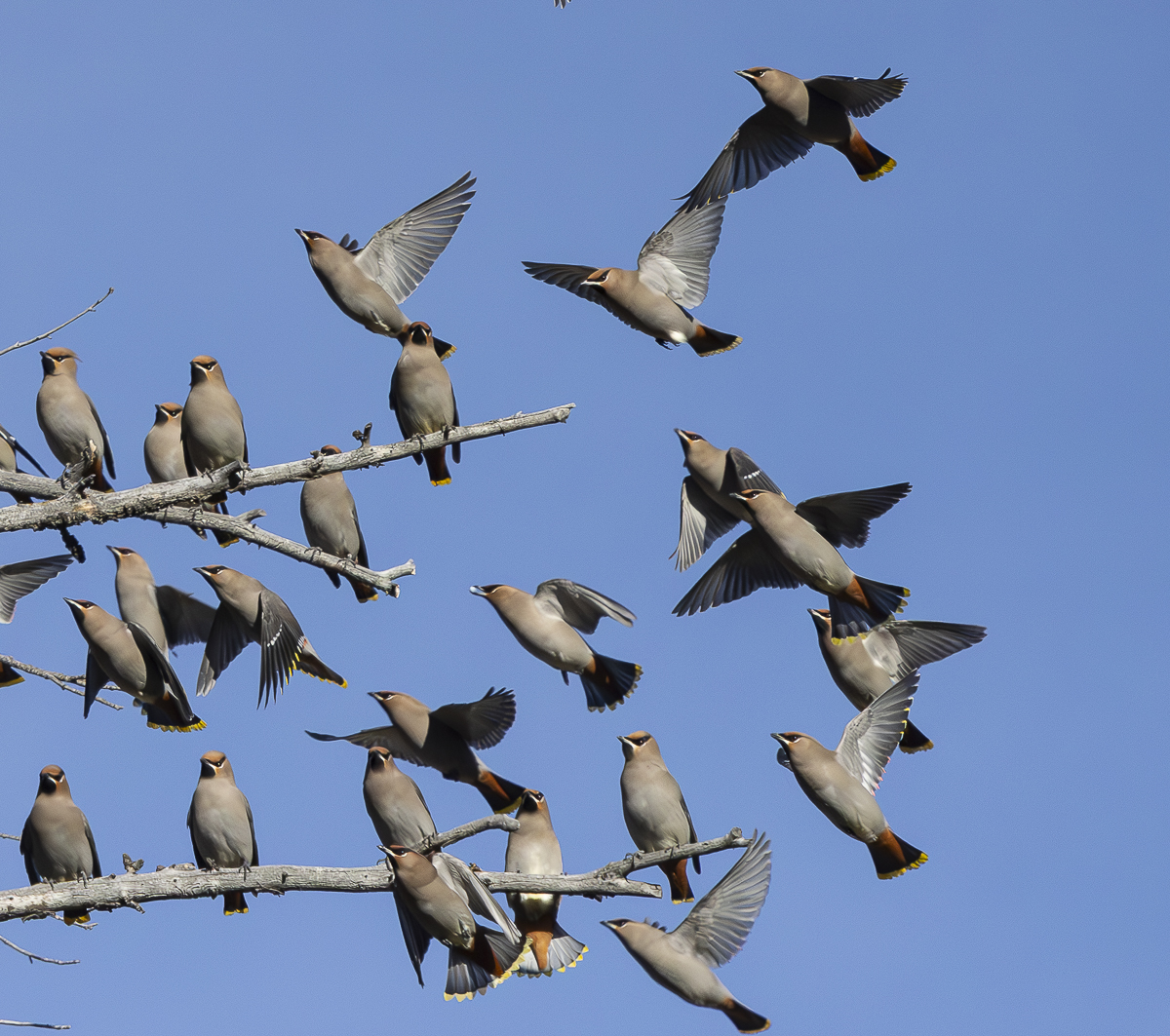 The Bohemian waxwing flock on their preferred snag.The flock switched to a different juniper for their feeding frenzies but then would return to the same dead tree.Waxwings returning to their perch in the dead tree