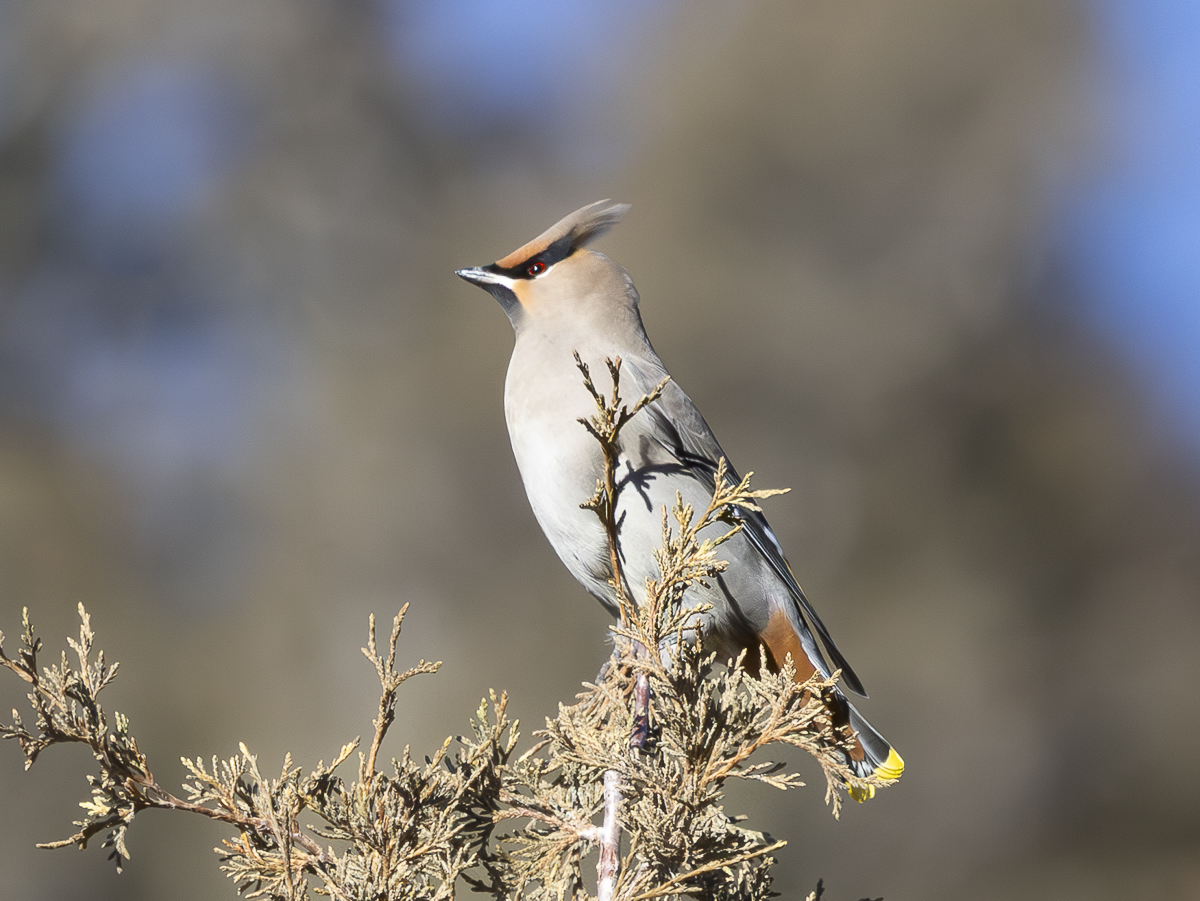 Bohemian waxwing in the top of a nearby juniper. The rust-colored under-tail feathers are diagnostic.