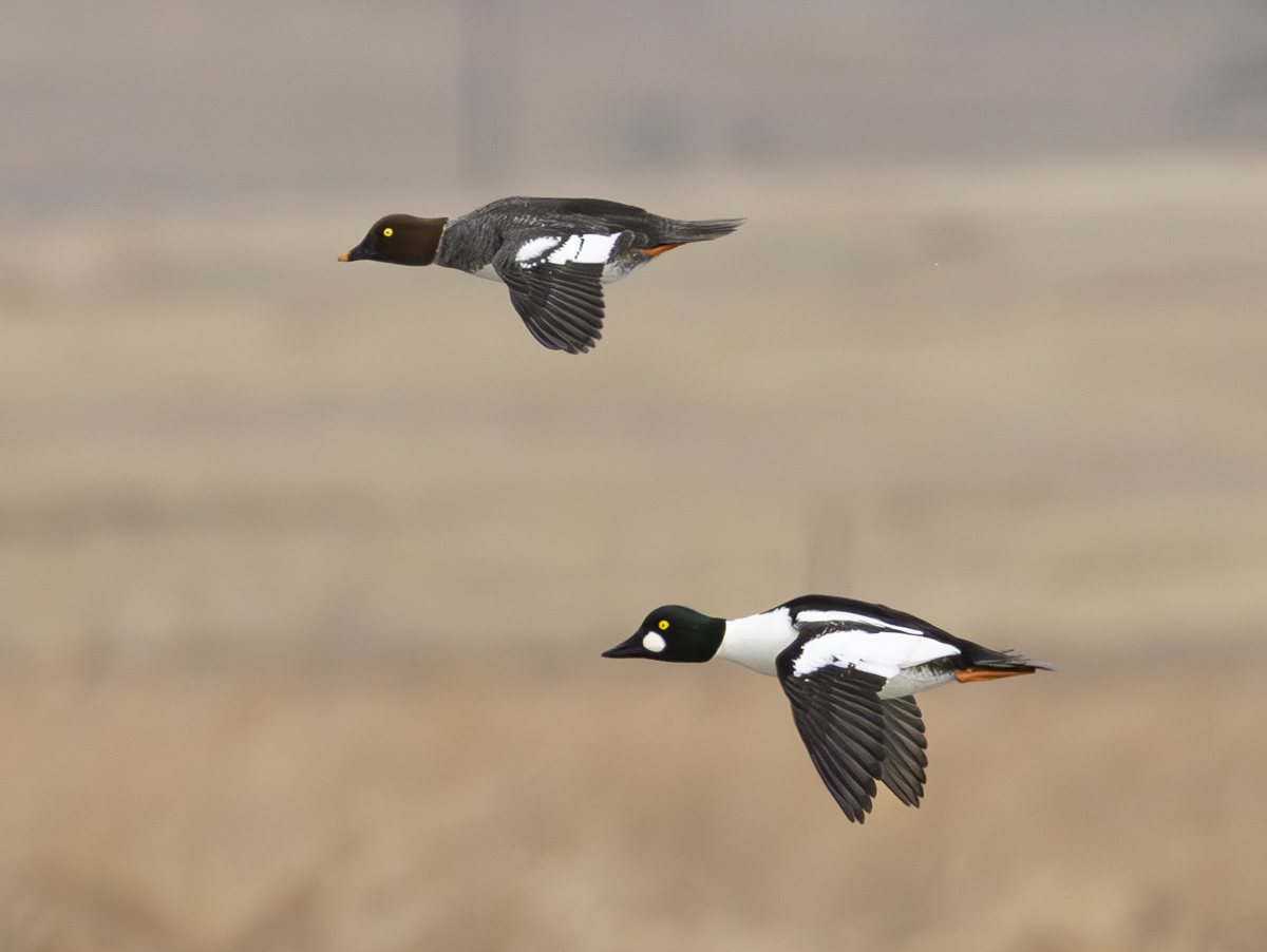 A drake common goldeneye displaying his beautiful feather colors and patternsA male (bottom) and female common goldeneye in flight