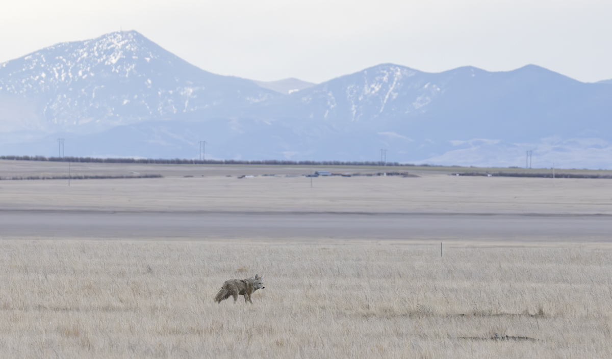 Three elegant Northern pintails zooming past us (two males, with extended tail plumes, and one female)A small flock of scaup in the early morning skyThis shot shows the lay of the land at Benton Lake as well as one of the terrestrial predators, a lone coyote (photo by Melissa Dowland)