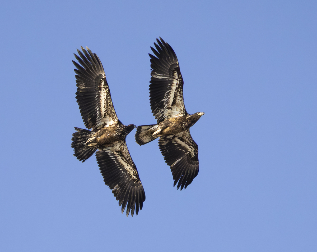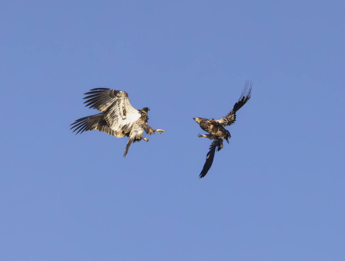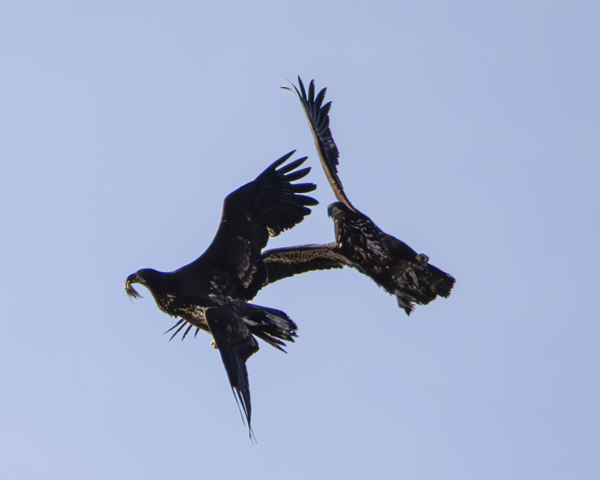 One particularly long game involved chasing an eagle that had a chunk of something (fish?) in its beak. At one point Melissa saw it drop its prize and a pursuing eagle snatched it in its talons and then transferred it to its beak while flying.