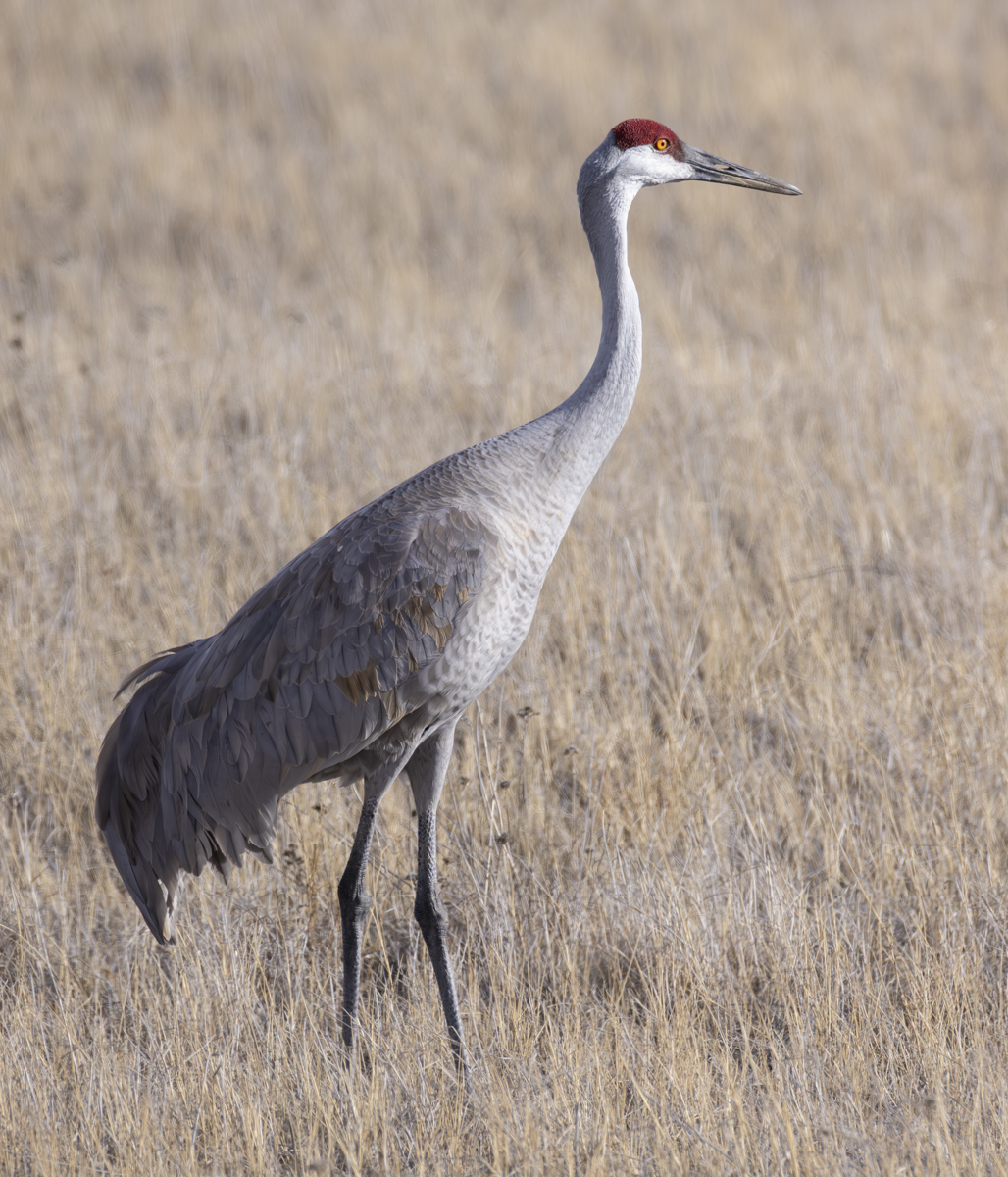 The unusual bulge of rump feathers (called a bustle) on these cranes is used for display during courtship and territorial issues. Though they look like tail feathers, they are actually specialized wing feathers.The eye of a crane in low angle light is a beautiful thing