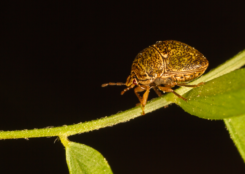 Their olive to brown coloration, nearly hemispherical body shape and their flattened posterior edge easily identifies the bugs. Some similar-looking native species have a rounded posterior.