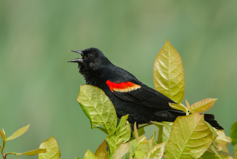 Male Red-winged Blackbirds have jet-black bodies with a bright red shoulder patch (epaulet) bordered by a yellow stripe at the bottom. And to make it even easier to find them, the males are almost always displaying this time of year. The most noticeable display is the so-called song spread where a perched male arches forward, spreads its wings to the side and exposes his red epaulets while letting out his distinctive song (usually described by a variation on the phrase konk-a-ree!). This display is meant to defend his territory from rival males and attract a female.