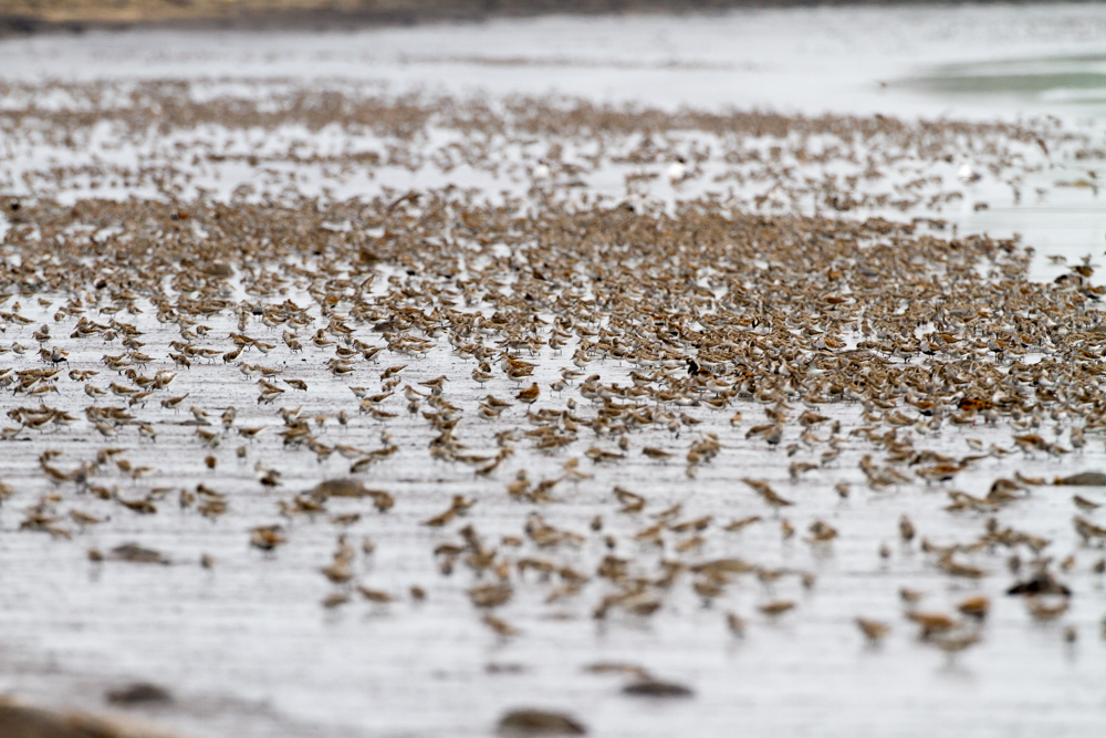 The migrants are made up of primarily four species: Semipalmated Sandpipers, Dunlins, Ruddy Turnstones, and Red Knots. The latter species is one facing steep declines in their population over the past decades. Researchers were on a distant beach the first afternoon of my visit as they have been for many years – capturing, weighing, and tagging Red Knots and other shorebirds to learn more about their needs in their perilous journey in the hopes of helping populations recover.