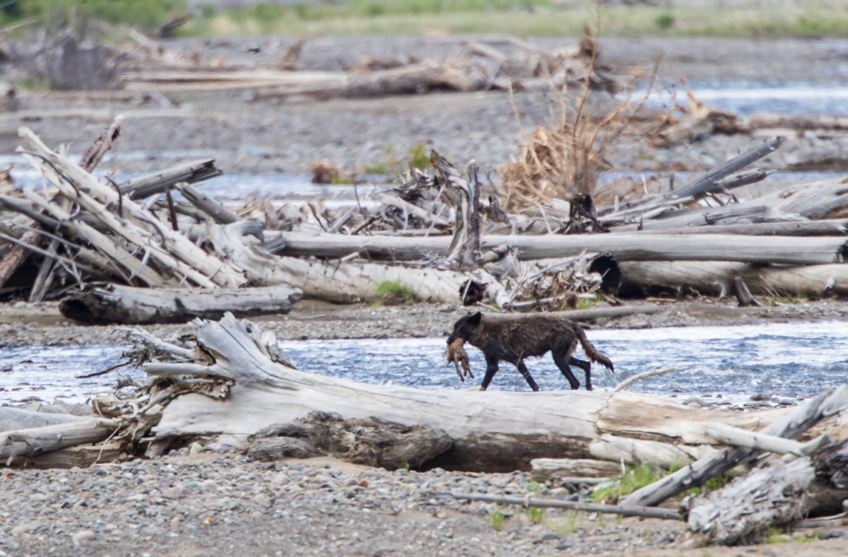 After catching my breath I turned my attention back to the black wolf who was approaching on the far side of the river carrying her prey. She moved quickly down the valley and then dropped the pup, looked back, and began wagging her tail.
