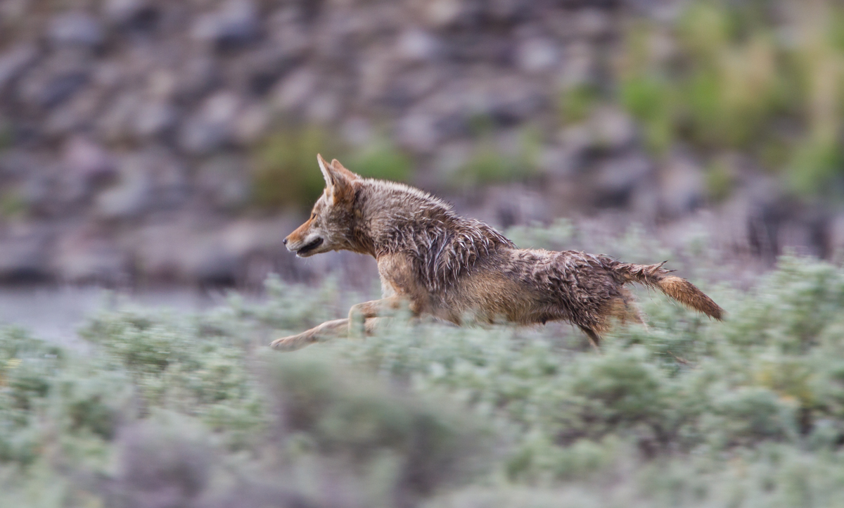 I quickly spun the camera and fired a few shots and managed to capture a couple of somewhat blurry images before they were all out of sight. The three of us looked at each other and appeared stunned at what had just happened. I am guessing this wolf was being chased by the coyote pair that had just lost their den in a somewhat unusual turnabout of roles with the coyotes being the pursuers instead of the pursued. The images here of the other wolves are heavily cropped – these of the running wolf and coyote are not cropped at all, showing how close they were. Apparently the wolf had crossed the river far downstream beyond our view and was being chased along our side of the river when she blew by us.