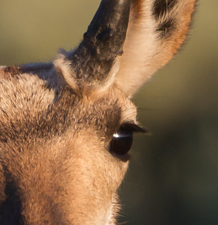 They have the largest sized eye of any North American ungulate in relation to their size with each eyeball measuring about 1 1/2 inches in diameter (about the size of the eye of a horse). The size and placement of their eyes gives them over a 300-degree arc of vision without moving their head, a useful trait for detecting potential predators at great distances. One reference said a Pronghorns’ vision is equivalent to that of a Peregrine Falcon and they may be able to detect movement up to 4 miles away.