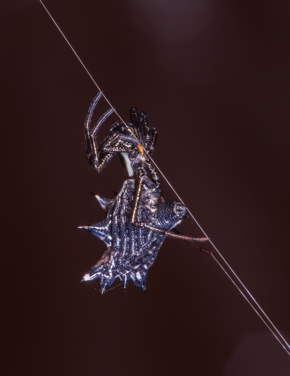 Yesterday while walking along a path in the woods, I encountered a spider web at about head height along the trail. I suppose it is one of the “hazards” of summer woods-walking around here. But I always enjoy seeing who the maker is and what they have had for dinner. This one was the tightly woven web of one of the most common, and unusual, spiders in this area – the Spined Micrathena. Females of these oddly-shaped spiders are adorned with stiff spines along the abdomen, presumably as protection against predators. Males are much smaller and lack the spines. Webs are typically 3 to 7 feet off the ground and strung between small trees and shrubs, often along pathways, perfect for ensnaring small flying insects or distracted woods-walkers. Luckily, these beautiful creatures are harmless, unless you are the size of a leafhopper.