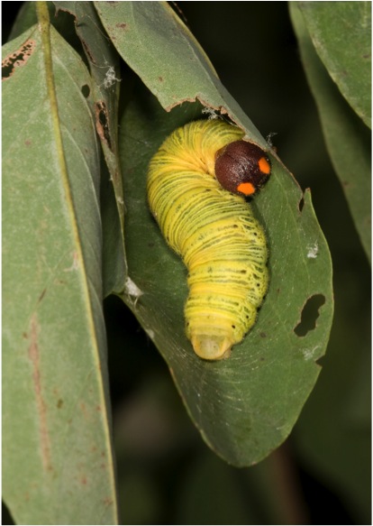 But, as is often the case for me, it is the caterpillar which I find most interesting. Like most skipper larvae, they are rarely seen because they spend much of the day in folded leaf shelters and come out to feed primarily at night. The caterpillar chews and pulls together leaf fragments with silk to form a shelter. This provides some protection from many predators. When you do find one, the first thing you notice about later instar larvae are the bold orange false eye spots.