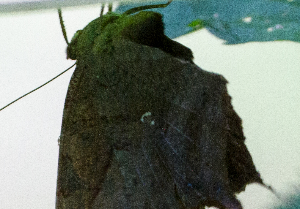 I often use the camera to help me identify species that are moving too quickly for a good view. Once you look at images on the computer, you can often see identifying characteristics more clearly. Such was the case in one photo this time – I could just make out the distinct marking on the underside of the wing that identified the egg-layer as a Question Mark, Polygonia interrogationis.
