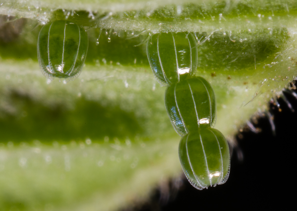 It wasn’t until I had set up to photograph the stack of two eggs that I noticed a cluster of eggs on a curled leaf at the tip of the branch, including a stack of three eggs. It looks so strange and even though I searched the internet and all of my reference books, I came up with no clear explanation as to why these species stack their eggs. Some butterflies, such as the Pipevine Swallowtail, have larvae that contain toxins and lay their brightly-colored (warning colors like orange or red) eggs in clusters. Their distasteful caterpillars usually feed in groups which may afford them more protection from predators. I also found a reference to a species in England whose stacks of eggs are said to resemble the flower parts of the host pant, thus camouflaging the eggs to a certain degree. None of these explanations seems to quite fit in this case, so the reason for egg stacking remains a mystery to me.