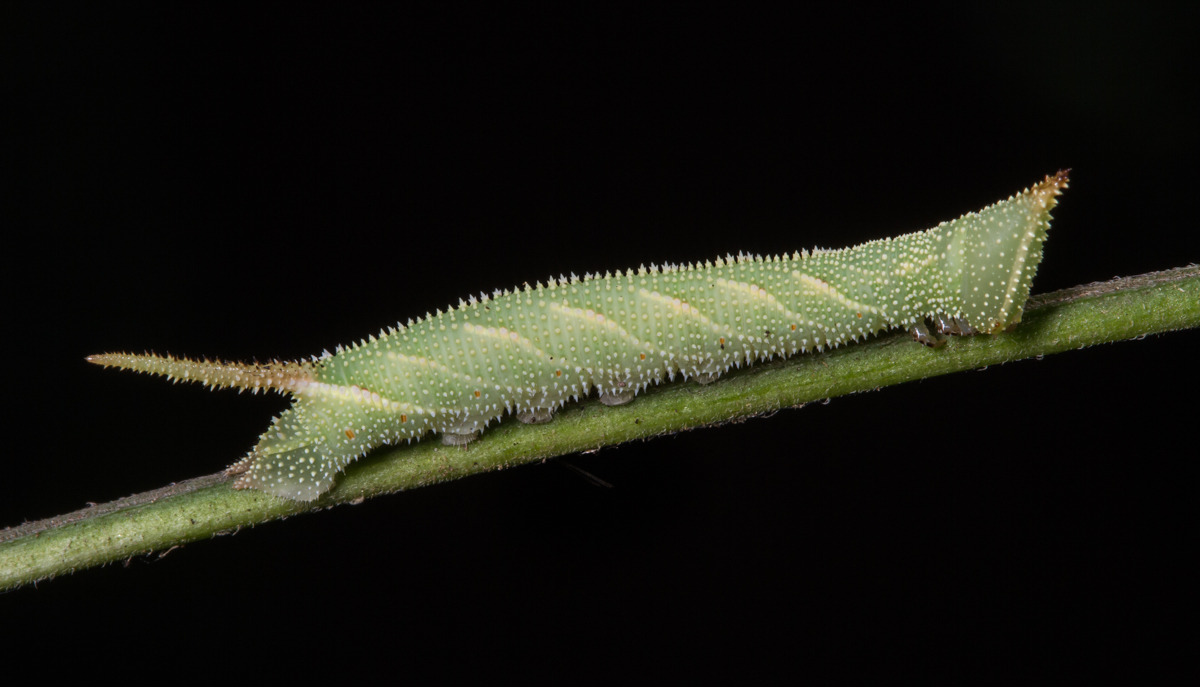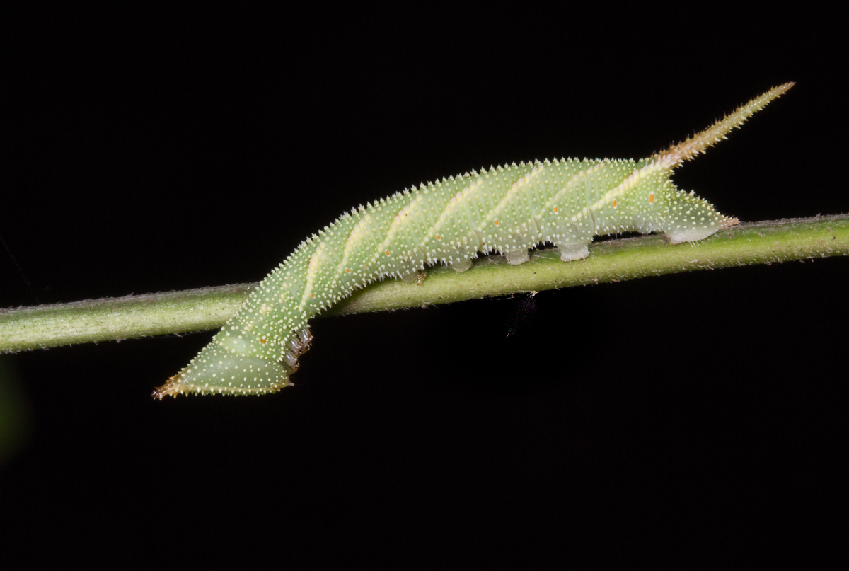 A few years ago I found the late instar larva pictured above. The head is less elongated and the white stripe alongside the head capsule is more pronounced as pictured in the field guides (most field guides showing caterpillars show only the last instar which can be quite different from the earlier ones, but, in this case, Wagner’s Caterpillars of Eastern North America also has an inset showing the pronounced head of the early instar). These caterpillars, as is the case for many others, are easier to find at night by flashlight when they are actively feeding. During the day, they often rest on the underside of a leaf along the midrib.