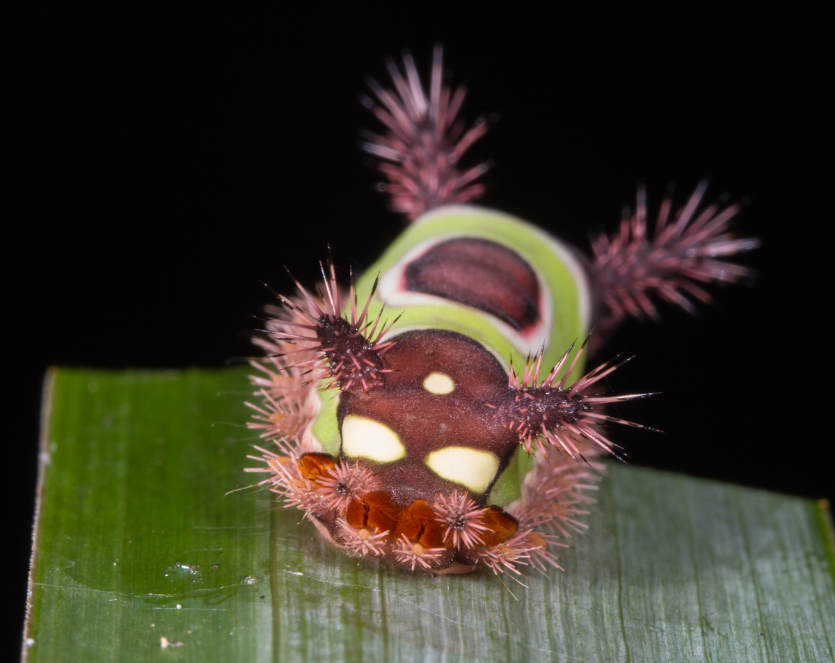 Several members of this family have the ability to inflict painful “stings” by means of sharp spines, which, on some species, have associated toxins to enhance the pain to the recipient. These stinging spines, known as urticating spines, are most numerous on the fleshy tubercles, or “horns”, adorning both ends of the caterpillar body. I have often found a caterpillar quite by accident when weeding in the garden or moving a plant leaf and then receiving a series of stings and resulting small welts where I brushed up against the spines. It feels a lot like a wasp sting but, for me, dissipates more quickly, although the reddish welts may persist for many minutes. But susceptible people may experience intense pain and allergic reaction, so caution is advised when you encounter these unusual beauties.