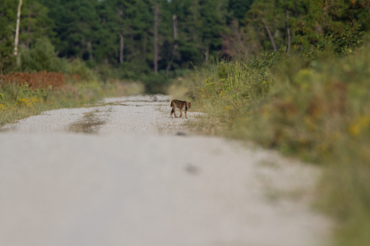 There are miles of gravel roads in the eastern section of Pocosin Lakes National Wildlife Refuge that pass through thousands of acres of seemingly endless shrub thickets, pines, and flooded forests. I have only been through this part of the refuge a couple of times and seen mainly Quail, Wild Turkey, a few deer, and some snakes. But yesterday afternoon I spotted something a few hundred yards down the road walking away from us. I stopped to check it out through binoculars. It was tough to tell at first, maybe a Coyote, maybe a Red Wolf, but then it turned and I could see the distant outline had only a short tail – a Bobcat!