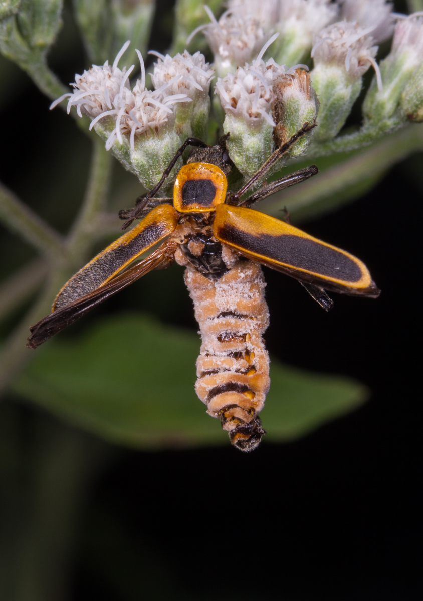 A close look at the dead bug shows a fuzzy white coating coming out between the segments of the lifeless body. The culprit is one of a group of arthropod pathogenic fungi. There are apparently many species of these insidious fungi, and many are host specific. The general life cycle is that an insect picks up a spore of the fungus on its exoskeleton while moving about in its environment. The spore then germinates and penetrates into the exoskeleton of its host via mechanical pressure and the production of enzymes which help dissolve an entry hole. Once inside, the fungus grows and divides. There is often an attack on the nervous system of the host which causes a change in its behavior near the time of death. In the case of these Soldier Beetles, they clamp onto the vegetation with their mandibles. In one study in Arkansas, an estimated 20% of the beetles surveyed in a field were infected by the fungus. And in an interesting finding, the researchers observed “by an unknown mechanism the fungus causes the dead beetles to raise their elytra between 2400 and 0700 hours during the night”. The position of the raised wings presumably provides a more efficient means for the fungus to disperse its spores from the dead insect.