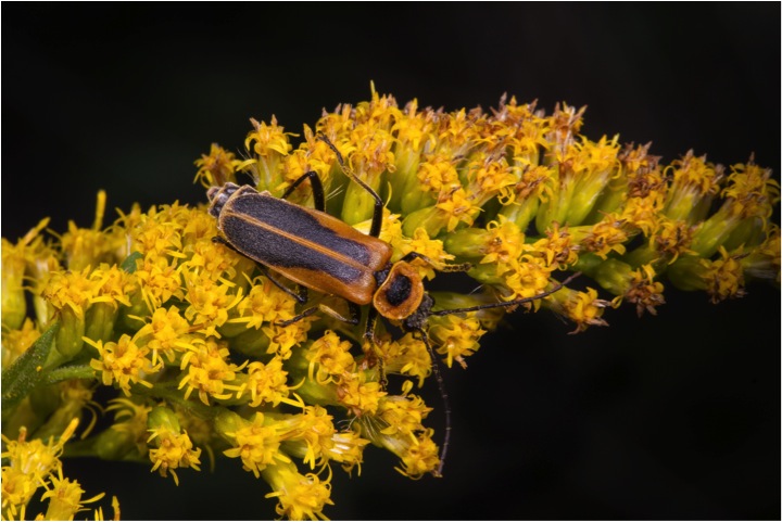 The patch is abuzz with all sorts of insects feeding on the copious quantities of nectar and pollen to be found in the golden buffet. Among the many foragers are a group of common beetles known as Soldier Beetles (also known as Leatherwings), Chauliognathus sp. They are busy feeding on pollen and mating and are frequent visitors to various species of goldenrod and boneset that occur on the power line. In the past couple of weeks I have noticed something strange happening amongst their ranks…