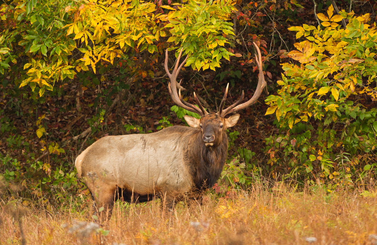 I had an outing this weekend with a great group of folks in Cataloochee Valley and up on the Blue Ridge Parkway. Our goals were to observe the elk during the mating season ritual called the rut and experience the beauty of the mountains during the fall leaf season. I’d say mission accomplished on both. It was overcast and cool on Saturday morning as we drove into the valley. We were greeted at the entrance by one lone bull elk and a little farther down the road a large crowd of visitors at the first elk herd.