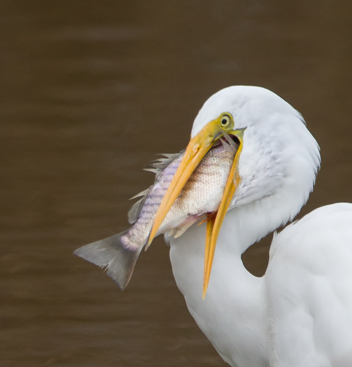 I am not quite sure what species of fish this is, although it resembles a Spot…if you know, please comment on the blog. Luckily, the egret paused long enough for a few quick images before getting behind some brush on the shore of the canal. Although partially hidden, I could see the fish did finally get swallowed, appearing as a large, squirming lump as it passed down the long neck of the bird. Made my PB&J seem easy.