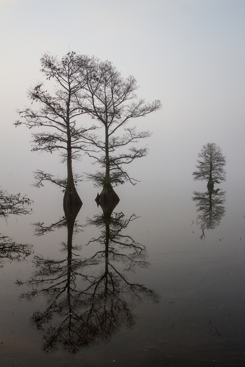 What I found was a surreal scene as the pale light of the rising sun tried in vain to penetrate the gray curtain laying across the lake. A few skeletons of cypress trees in the foreground provided the only depth in the scene.