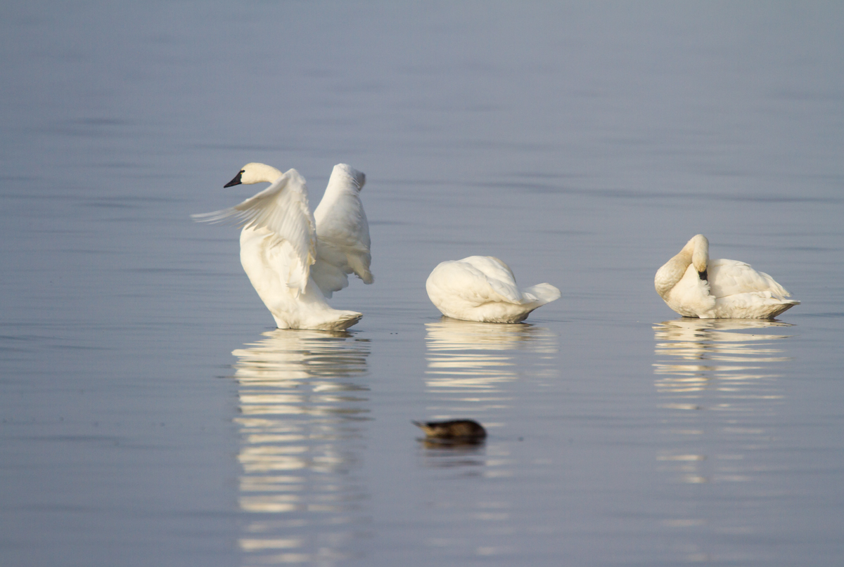 The sun was starting to win the battle as I drove across the lake. A few Tundra Swans fed silently near the road, making glints in the water as they probed the lake bottom for some breakfast of aquatic vegetation.