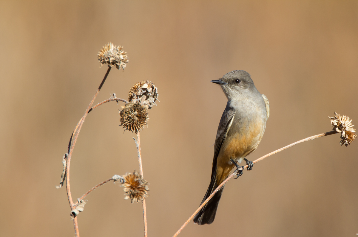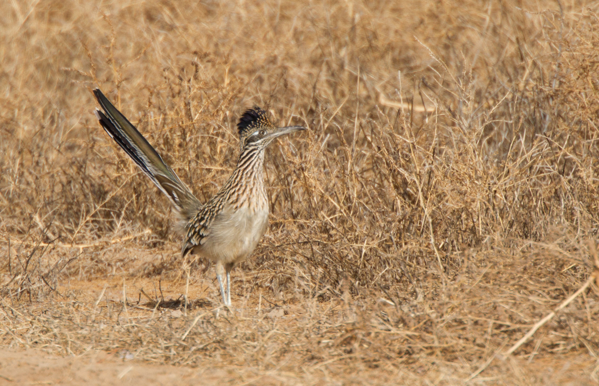 Other species of note included a few lifers for me – Gambel’s Quail, Say’s Phoebe, Lesser Goldfinch, and a much sought-after species observed late in the trip – a couple of Greater Roadrunners. The first Roadrunner was a real skulker alongside a roadway and the second was noticed because of an unusual behavior. Roadrunners fluff up their feathers as they turn their back toward the sun to soak up warmth – they look like a dark gray puffball with a brown neck as they sit in the open for up to several minutes.