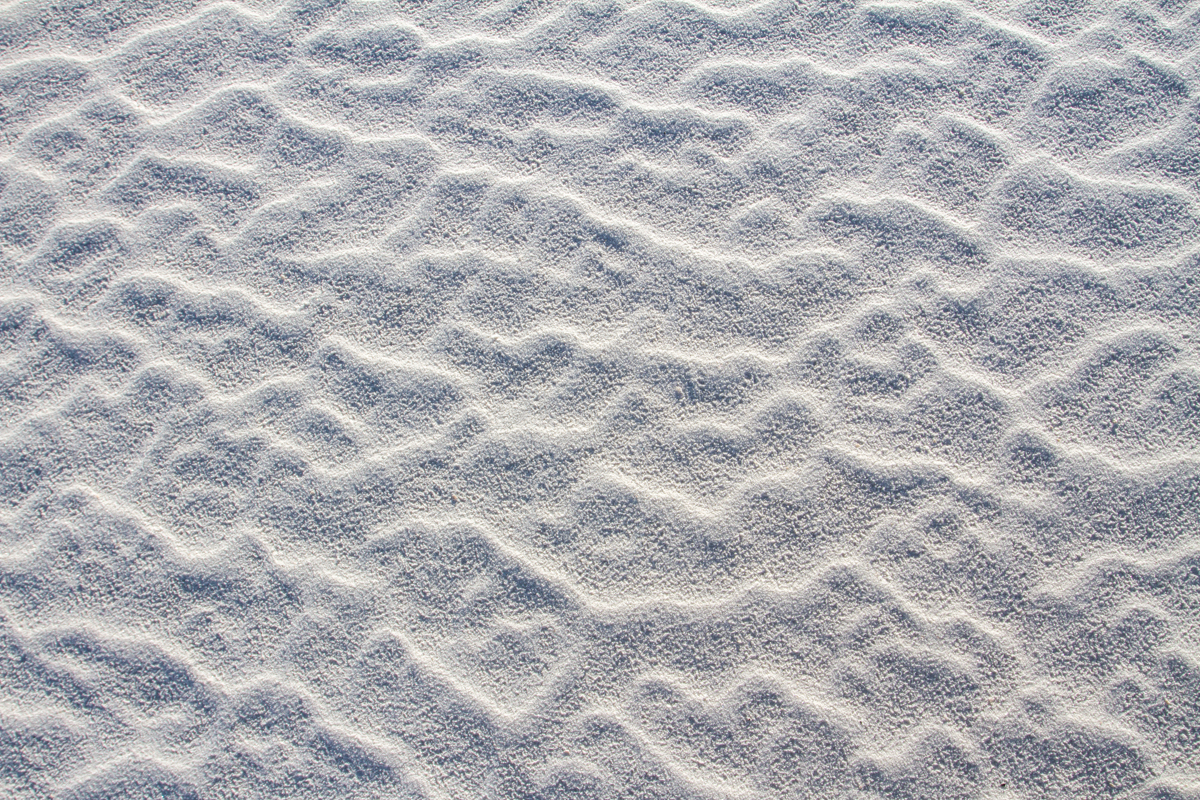The dunes at White Sands are derived from gypsum-bearing marine deposits laid down in a shallow sea over two hundred million years ago. With the subsequent rise and fall of the surrounding region, the present day Tularosa Basin was created, nestled between the San Andres and Sacramento mountain ranges. Since no rivers drain the basin, runoff from the surrounding mountains, laden with gypsum and other sediments, is trapped in the basin. This water then pools in low spots, often forming huge shallow lakes. When that water evaporates in the windy, dry environment, it deposits gypsum in the form of selenite crystals, which eventually break down from weathering into sand-sized particles. The white sands can now be moved by the winds and shaped into the dunes that cover 275 miles of desert, creating the largest gypsum dune field in the world.