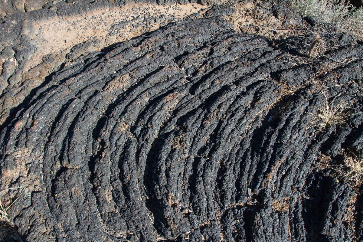 Walk cautiously out onto the flow and you can see the structure of the lava which includes many features that are more often seen in fresh Hawaiian lava flows. One of the most apparent is the pahoehoe texture of the surface of the flow. The texture forms when the surface of the flowing lava begins to cool, and the underlying, hotter lava is still flowing. The cooler surface is dragged along by the flowing lava underneath, and forms the wrinkled or coiled rope appearance.