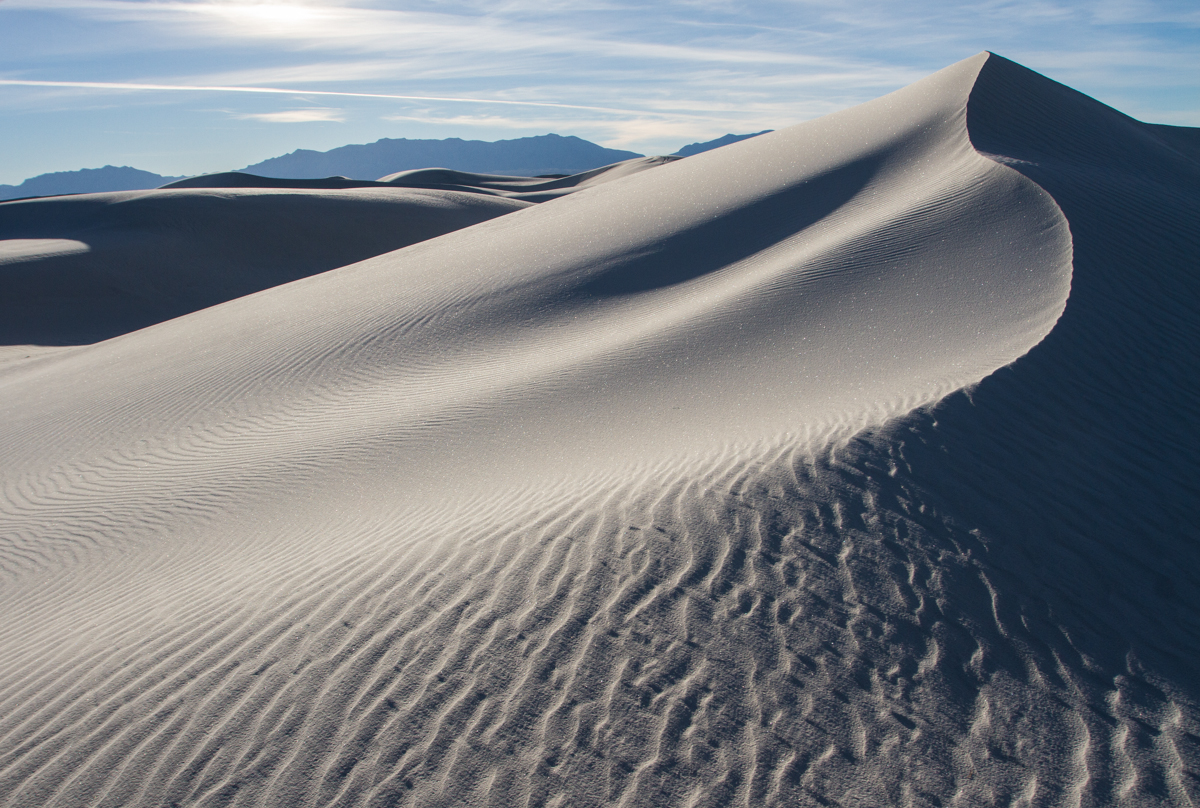 As the sun sinks toward the mountains ringing the horizon, the light changes and the dunes begin to transform. Their delicate hidden details begin to emerge, outlined by artistic shadows thrown by the low angle light.