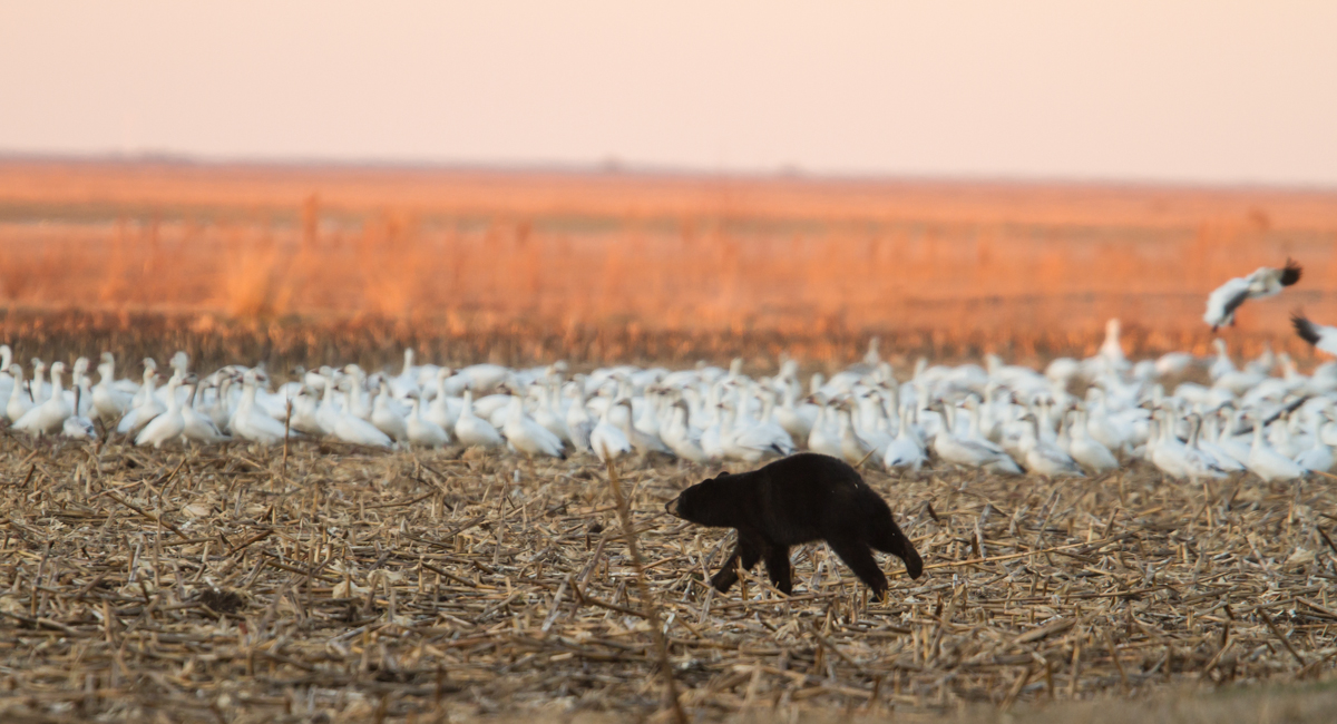 A few birds spooked and flew, but more were landing all the time. The bear stood up as more Snow Geese began to circle and land nearby. If only I could read a bear’s mind…The bear then walked off the field, leaving the corn to the growing, noisy flock.