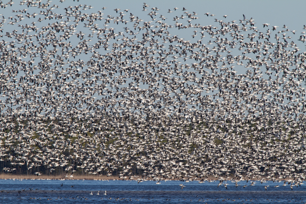 Far out on the lake was a huge raft of Snow Geese packed into a solid white line on the water. They blasted off two or three times while we were in the blind, but simply circled and settled noisily back on the lake, instead of flying out to feed. Mixed in with the swans and geese were hundreds of other waterfowl, mostly Green-winged Teal, Gadwall, American Wigeon, and Northern Pintails.