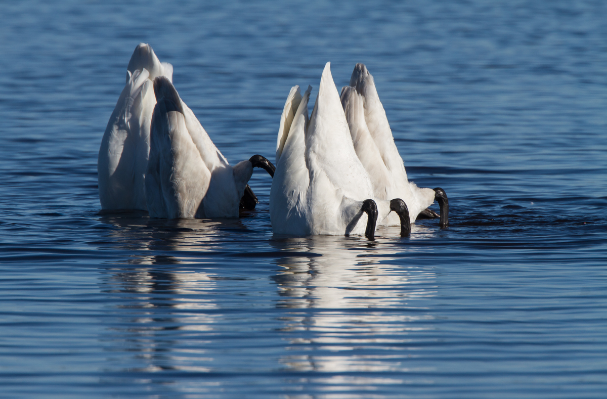 One of the newer visitor services additions on the refuge is the Duck Pen Observation Blind farther down the road on the south shore of Pungo Lake. A short hike from the parking area leads to a large wooden enclosure with a great view out on the lake (although I hope to volunteer once the waterfowl are gone to cut a few more observation ports and make some of the existing ones larger to accommodate telephoto lenses). Since the winds were out of the south, the waterfowl were in close to the south shore, making for some great views. Swans were feeding in the shallows, something I see all the time at Mattamuskeet with its abundant aquatic vegetation, but rarely here at Pungo Lake, due to the peat lake bottom and relative lack of plants and aquatic life.