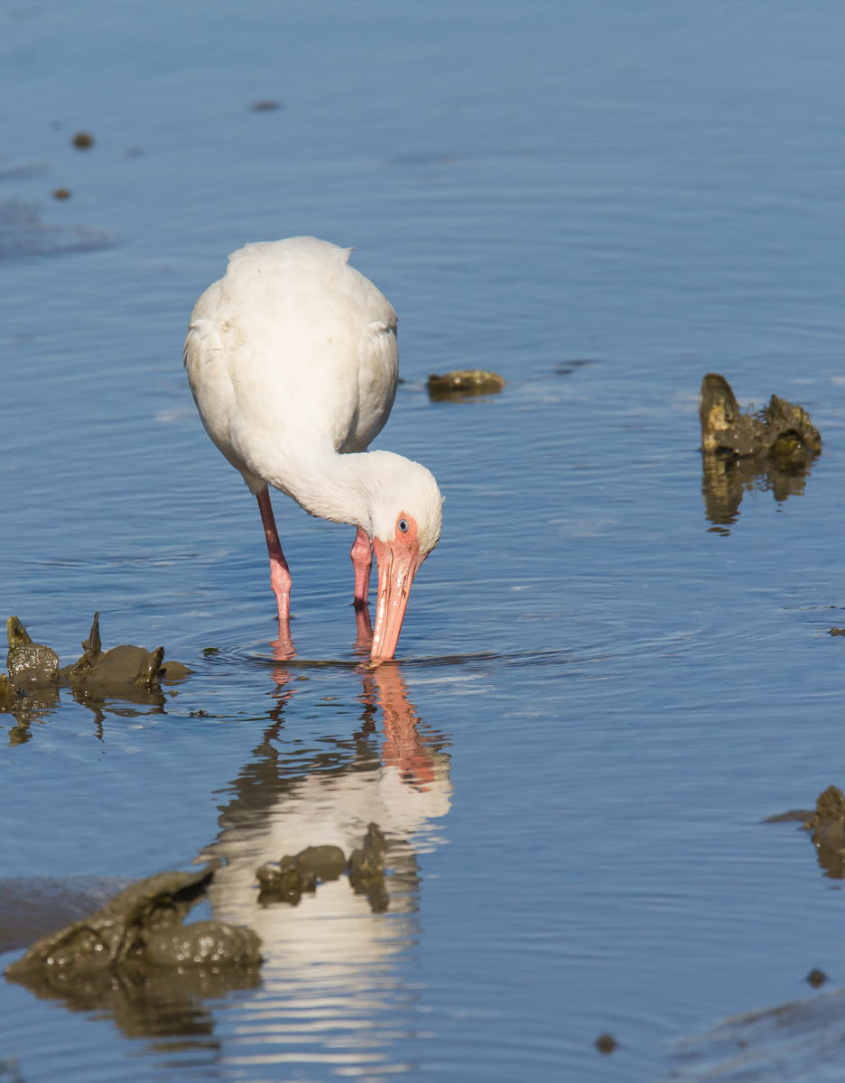 There were plenty of ducks on the pond side, but very little activity on the marsh side of the causeway (which is where the good light is in the afternoon). Finally, a couple of White Ibis landed and started feeding in a tidal channel amongst the exposed oysters. They probed and swung their head from side to side. Periodically, they would open their long bill, and with a snap of their head, gulp down some unseen prey.