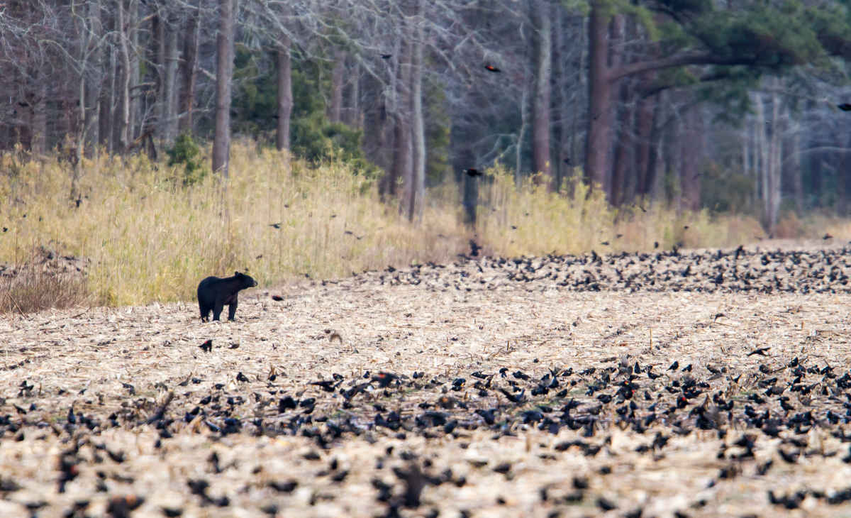 Black Bear ventures out into corn field surrounded by hundreds of hungry Red-winged Blackbirds (click photos to enlarge)