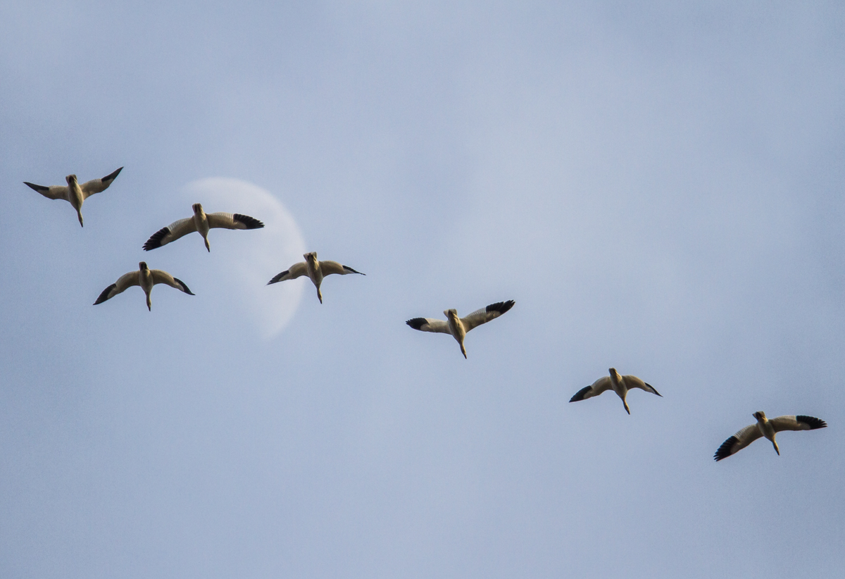 While observing a large group of swans in a flooded corn field, I suddenly spotted some unusual visitors – Sandhill Cranes! Two small groups, totaling five cranes, flew by us out toward private farm fields to the west. While they were a considerable distance from us, there is no mistaking the distinctive flight pattern. I managed a few quick shots of one group before they disappeared. I have only seen Sandhill Cranes here one other time in all the years I have been coming to the refuge.