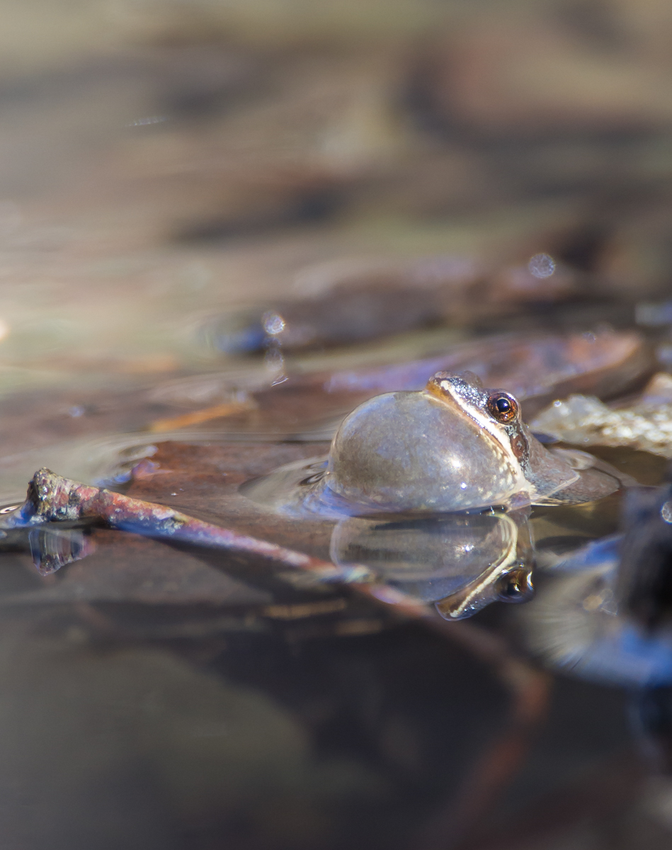 So, I waited some more. Another 15 minutes went by and I was beginning to wonder if I had simply tried to get too close and they were having nothing of it. Then a sound – a partial call. The call of the Upland Chorus Frog sounds something like the noise made by running your fingers over the teeth of a comb – a regularly repeated “crrreek”. This was just one crrreek. But that was enough to stimulate another, then another, and soon the pool sounded like a bunch of busy fingers in a comb factory. Ten or more heads suddenly appeared from the pool and started calling, with the tell-tale enlargement of their vocal pouch keeping time with their crrreeks. The first few callers were partially hidden, either barely out of the water or using some nearby object as cover.