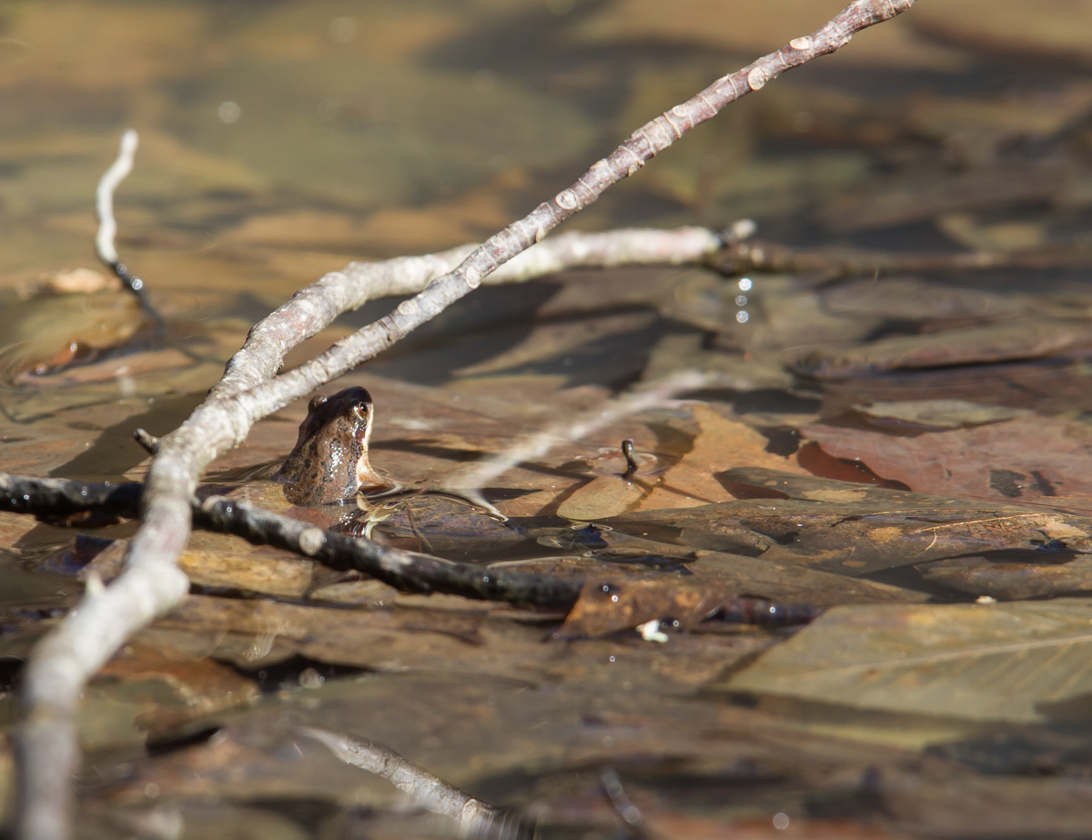 As suspected, my approach and settling in quickly silenced the almost deafening chorus, so I got situated under the blind, leaned against the tree trunk, and waited. And then waited some more. About thirty minutes went by without a sound except for leaves blowing in the wind. And I could still only see one frog in the pool, and even that one was low in the water and partially hidden by a stick. I decided to try to coax a reaction by using my phone to search the web and play a recorded call. I used the Amphibians and Reptiles of North Carolina web site created by Davidson College at http://www.herpsofnc.org/. I played the call twice. No response. I looked through my viewfinder at the one visible frog and played the call again. This time, that frog raised up so that the top half of its body was out of the water. I suppose he was trying to figure out where this caller was hiding. But he did not answer.