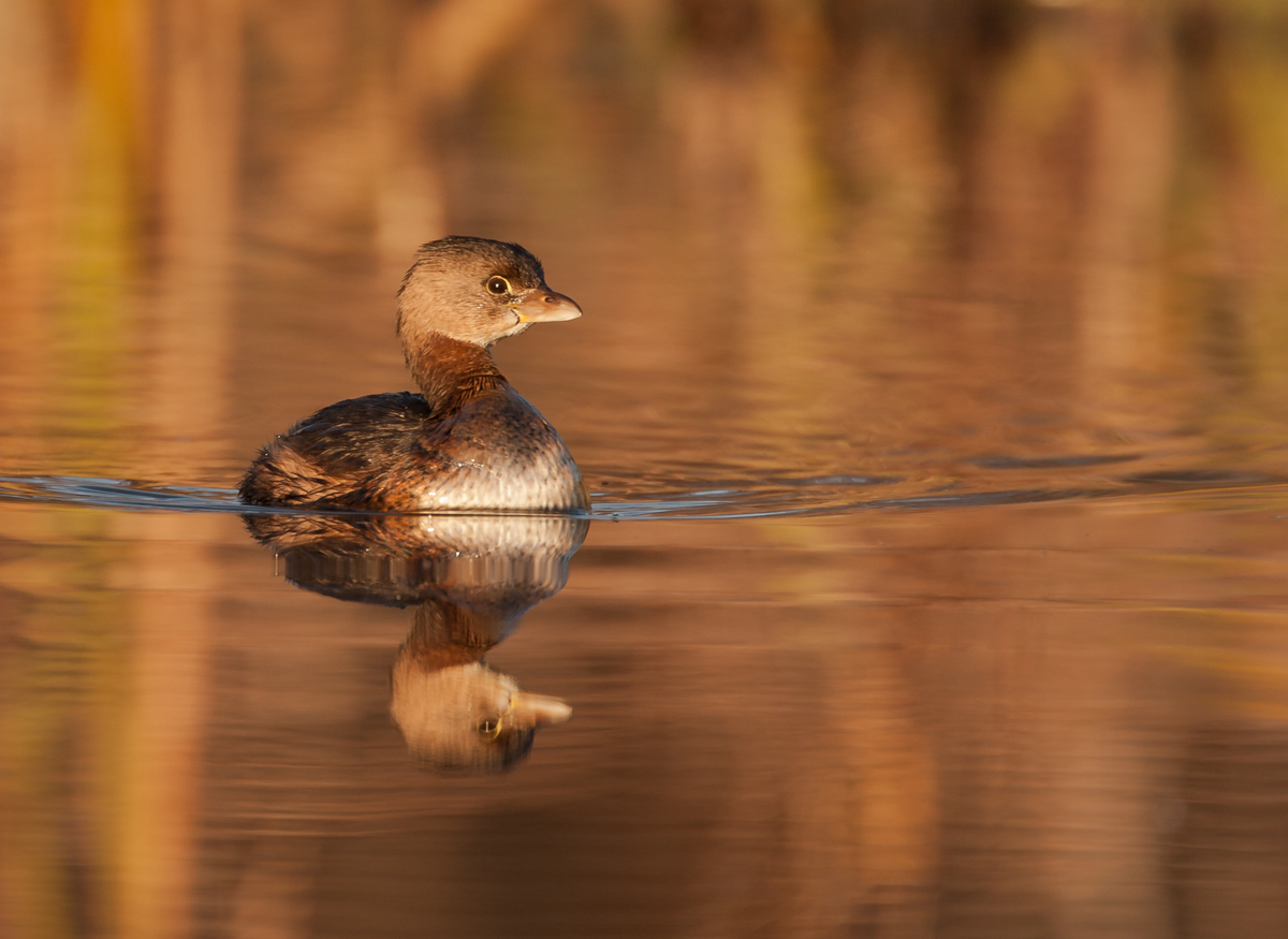 Both of the birds I saw this weekend exhibited that behavior, and in an expert manner. Noted ornithologist, David Allen Sibley, describes this behavior – “by contracting their abdominal muscles and thereby compressing their plumage, while at the same time exhaling, small grebes can submerge themselves from a resting posture on the water’s surface without diving. In this manner they can adjust their buoyancy, for hunting or concealment from predators; small grebes are often seen with only the head or bill above the surface.”