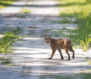 Bobcat walking away from me in road 1