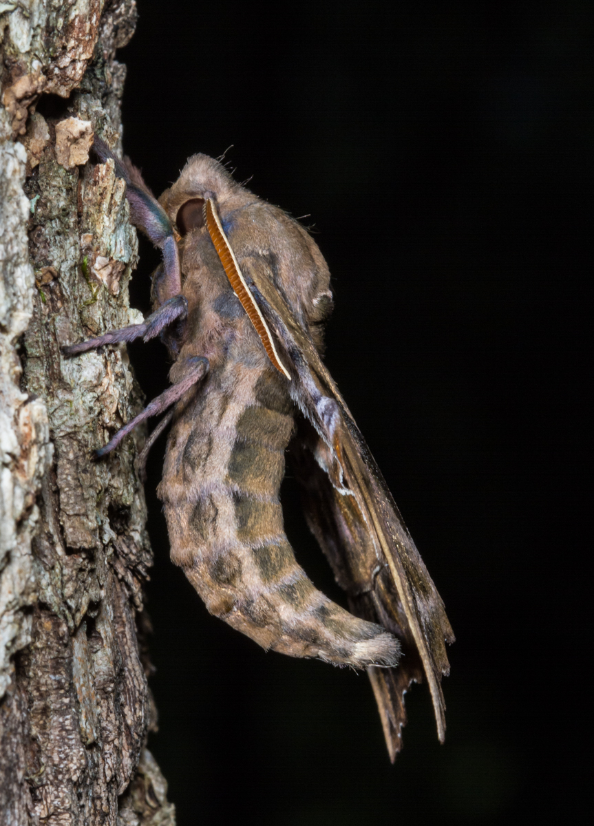 Key features for identification include the black stripe down the middle, the wavy edge on the hind part of the fore-wings, the purplish cast to the upper portions of the body, and a black area on the hind wings containing a blue spot with no black spot in it. This blue spot on each hind wing is said to resemble an eye iris. The lack of a black spot (or pupil) in that iris makes this a “blind” sphinx (hence the common name), when compared to other species that contain a black spot. But, my moth was apparently shy, and I was having trouble getting it to show me its “eyes”.