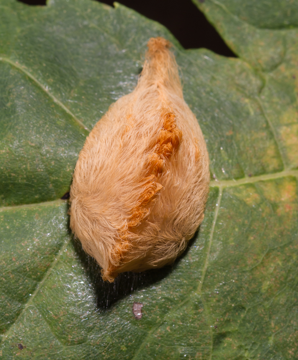 I found one last week on a Red Maple. This species feeds on a variety of tree leaves, which fortunately makes it less likely someone will accidentally encounter one unless it falls out on you or you are climbing up there amongst them. This one looked a little different than most I have found, especially in its more strawberry-blonde coloration. But there was something else I couldn’t quite peg. I found an incredible online resource on these moths and their larvae that helped me see the reason (see http://entnemdept.ufl.edu/Creatures/MISC/MOTHS/puss.htm). Turns out, the color can vary from grayish-brown to tan. The big thing I learned was about the different looks of this caterpillar as it goes through its various molts (instars). The caterpillar had become still a couple of days ago and made a silken pad for itself on a leaf. This is usually a sign of impending change, a molt. After reading more about it and seeing pictures of the last two instars of these larvae, I went out to look at my Puss Caterpillar again.
