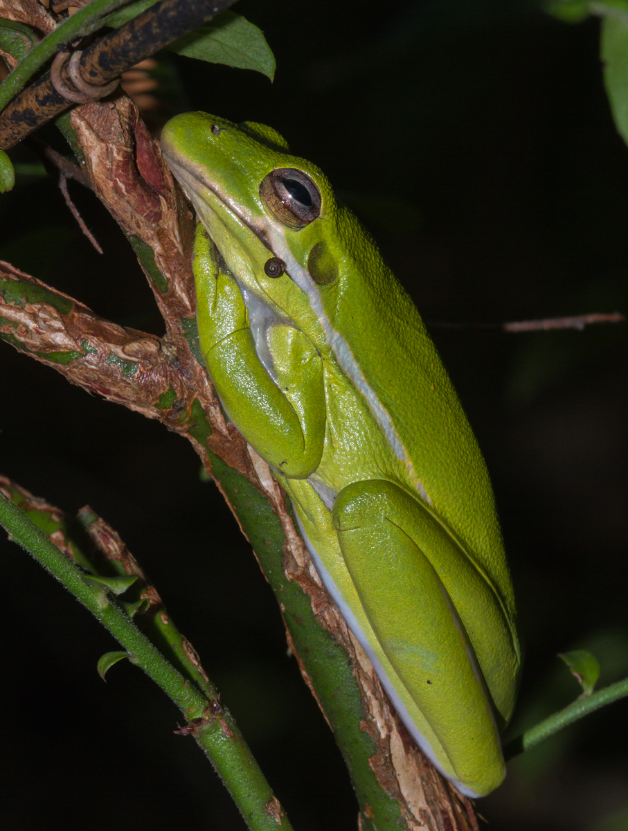 On a recent walk in the South Carolina Low Country, I spied a bright patch of color clinging to a limb on a blueberry bush – a Green Treefrog. I love the way these guys clutch vegetation during the day – in a tucked in position with a satisfied look in their intricately patterned eyes. I always stop and take a look whenever I see one, and usually grab a photo. I was lacking my usual macro set up so I just took one shot and was about to move on when I took a closer look.