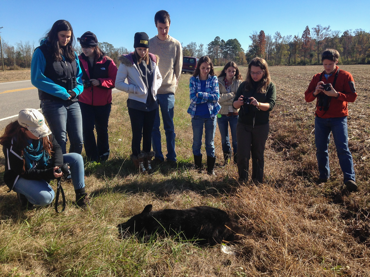 As we continued on toward Mattamuskeet, we saw a car sitting along the road, flashers blinking. As we pulled up, we could see why – a roadkill Black Bear. It was a small bear, less than 100 pounds I guessed, probably dead less than a day. The students all piled out of the vans to take a closer look – sad for the bear, but a learning opportunity to see one of these animals up close. The other car had stopped for the same reason, just to look.