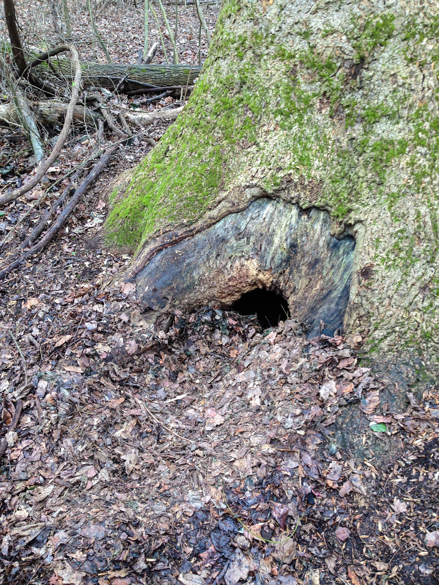 The wet conditions made for very quiet woods-walking, so we headed into the trees, looking for signs of wildlife. And the signs were everywhere. We soon spotted a young bear, sitting against a large tree trunk. We all watched it, the bruin returning our gaze, until it finally stood up and ambled off into the thickets. We checked out its tree and found where it had been laying down. There was a nice pile of flattened, dry leaves where the bear had been laying, surrounded by wet leaves from the rain. There was also some chewing on the edges of a hollow leading under the base of the tree, as if the bear was trying to enlarge an access hole for an entryway. We continued on, noticing the abundance of bear and deer trails.
