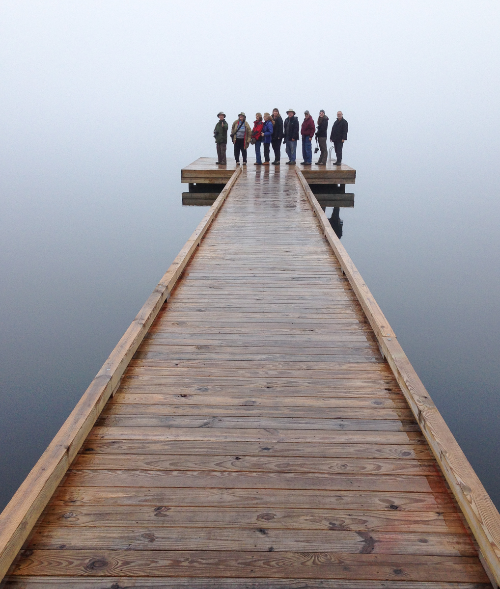 In all my trips over the years to this lake, I have never experienced the silvery curtain we had that afternoon. The water surface was glassy, and everything seemed suspended in a gray sky. The group posed on what one dubbed “the dock to nowhere”. The grayness seemed to absorb everything, including sounds.