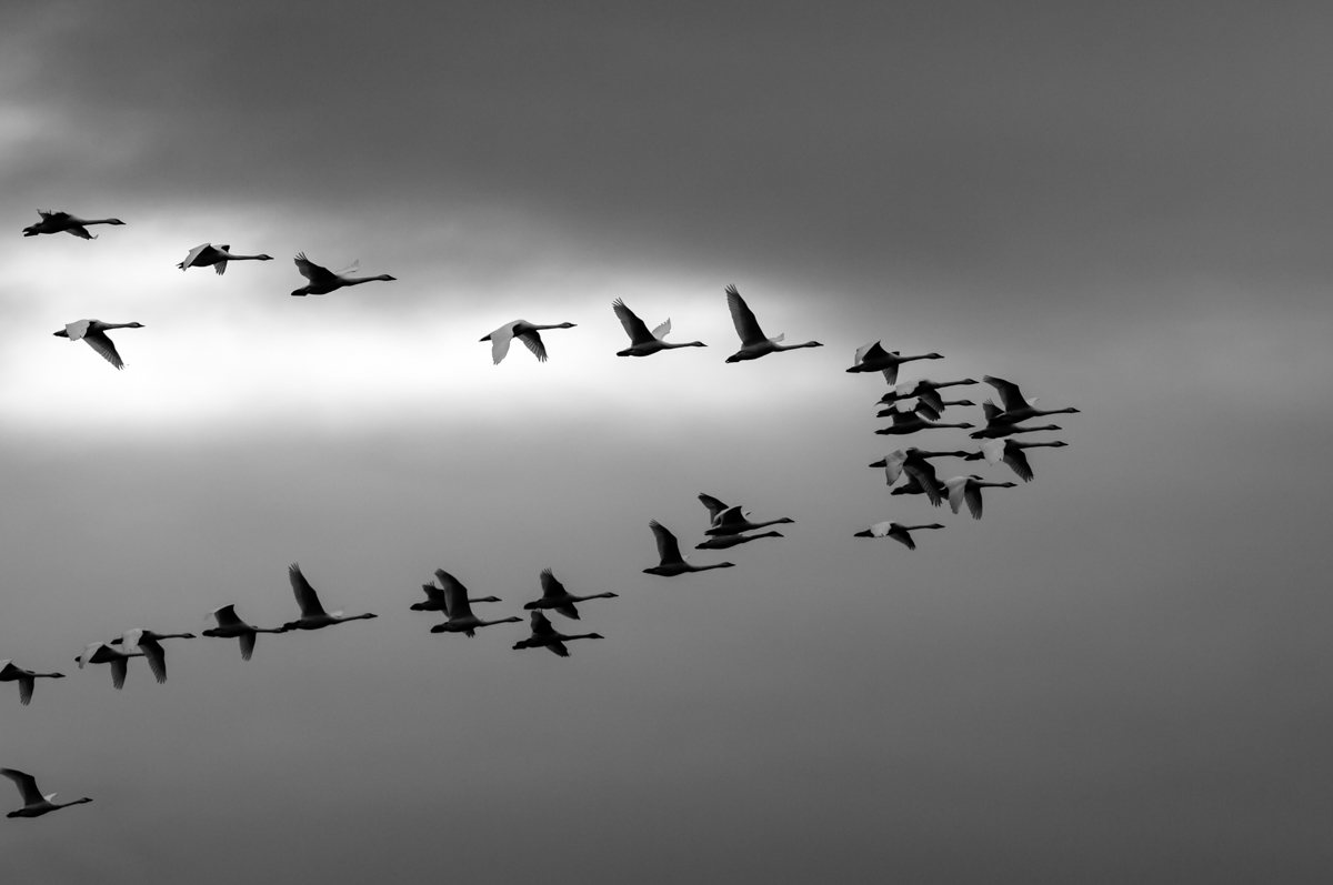 Then the unmistakable sound of incoming geese, and soon the sky was filled with a swarm of birds circling over the swans, trying to find a place to land. It is still a spectacle, even without the glow of an orange sunset like the night before.
