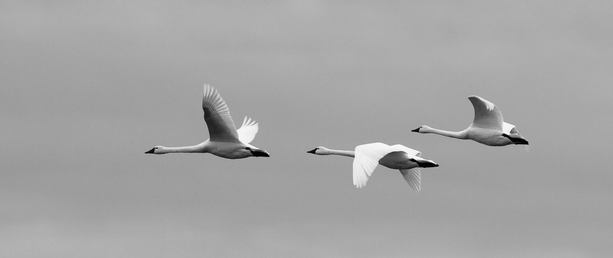 With all the birds flying overhead, it soon prompted the swans we were watching on the water to join in, providing us with the challenge of capturing BTO (birds taking off). Waterfowl tend to take off into the wind, so, if you watch their behavior, you can often predict when they will make their move. Swans have to run across the water to gain enough speed for lift off. They often swim with the wind until they get to a place that provides a good runway of open water, then they will turn into the wind and start slowly swimming, often bobbing their heads. Then, they start running, slapping those large feet against the water, and flapping their 6 feet of wing span until they achieve lift-off.