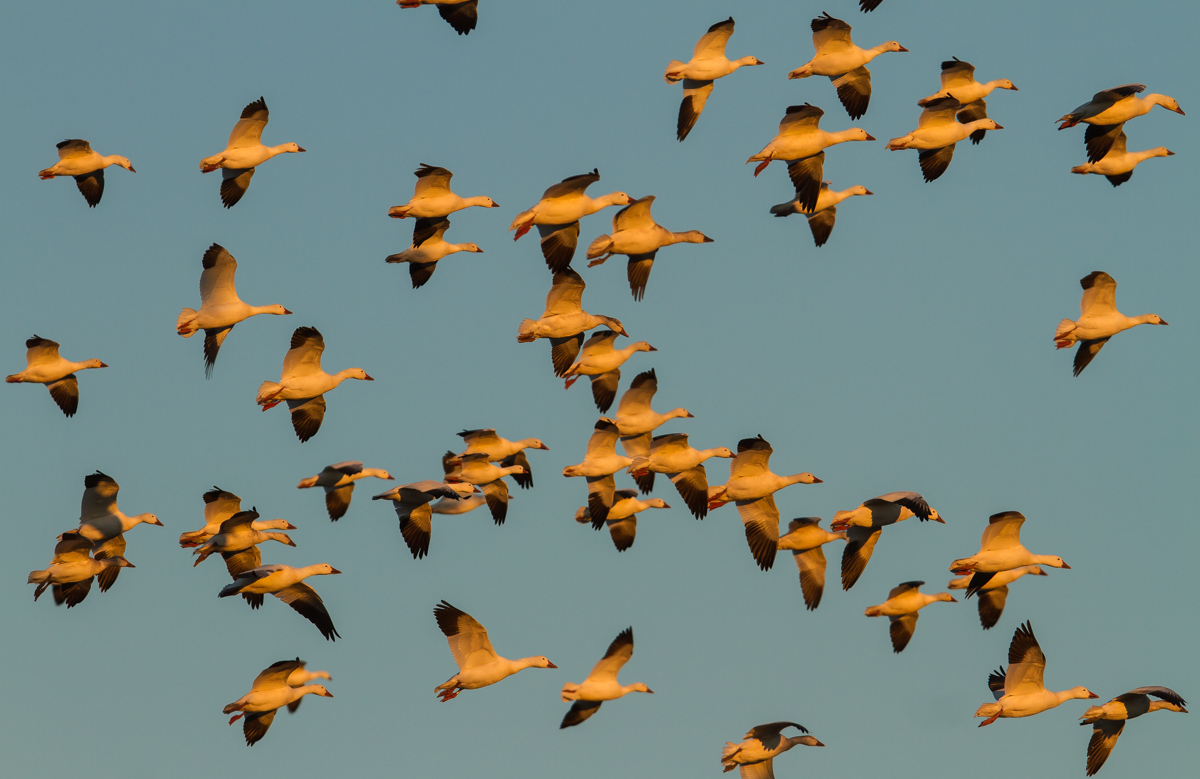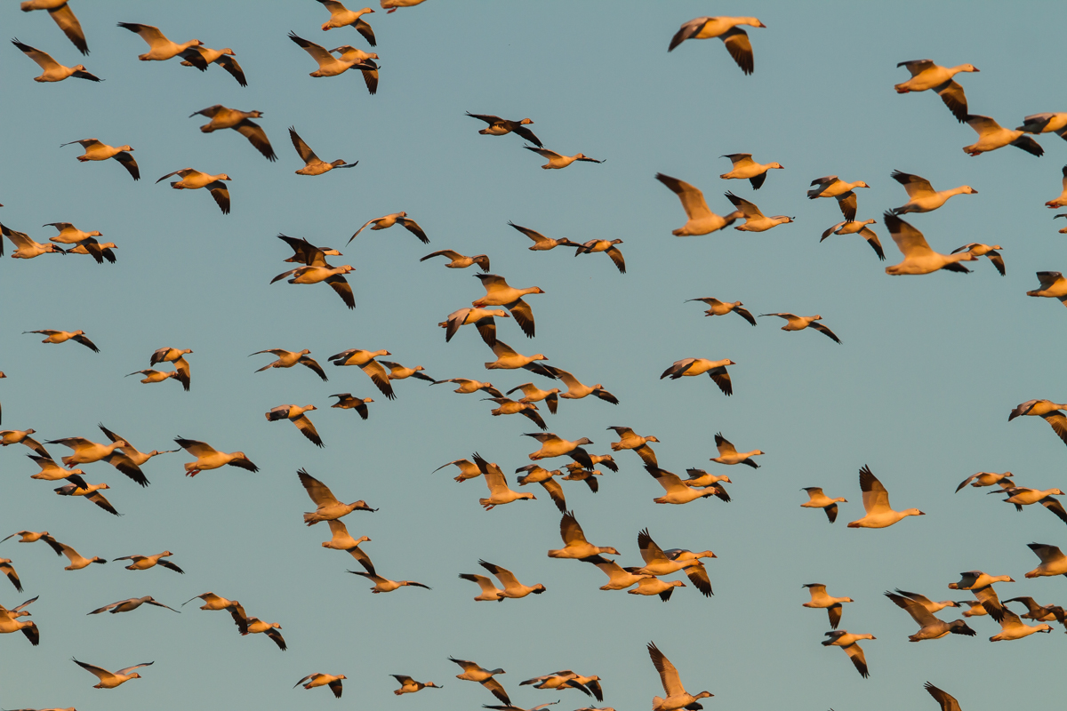 As we watched, the leading edge of the flock streamed our way and started to circle the field, the late afternoon light casting a golden glow on the underside of the birds. Looking back at the horizon, I could see thousands of Snow Geese headed our way, and we seemed to be in just the right place….let The Show begin.
